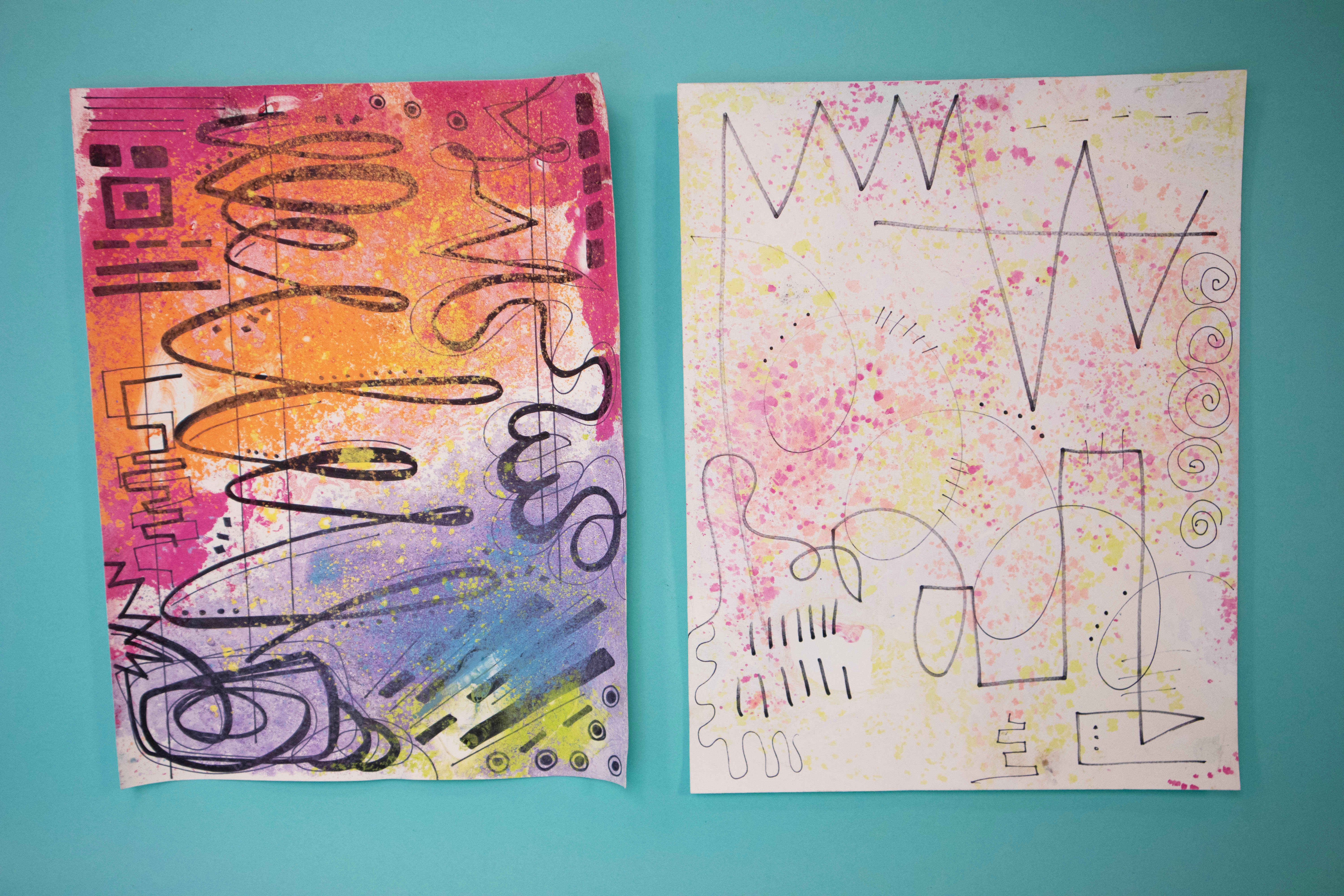 Abstract Expressionism was an art style created in the United States and offers a chance to think about American identity. For American History through Art tours, there’s a modified version of chalk printing we do. The workshop looks at abstraction through line, and finishes with a quick, colorful, experimental print made with chalk on water.