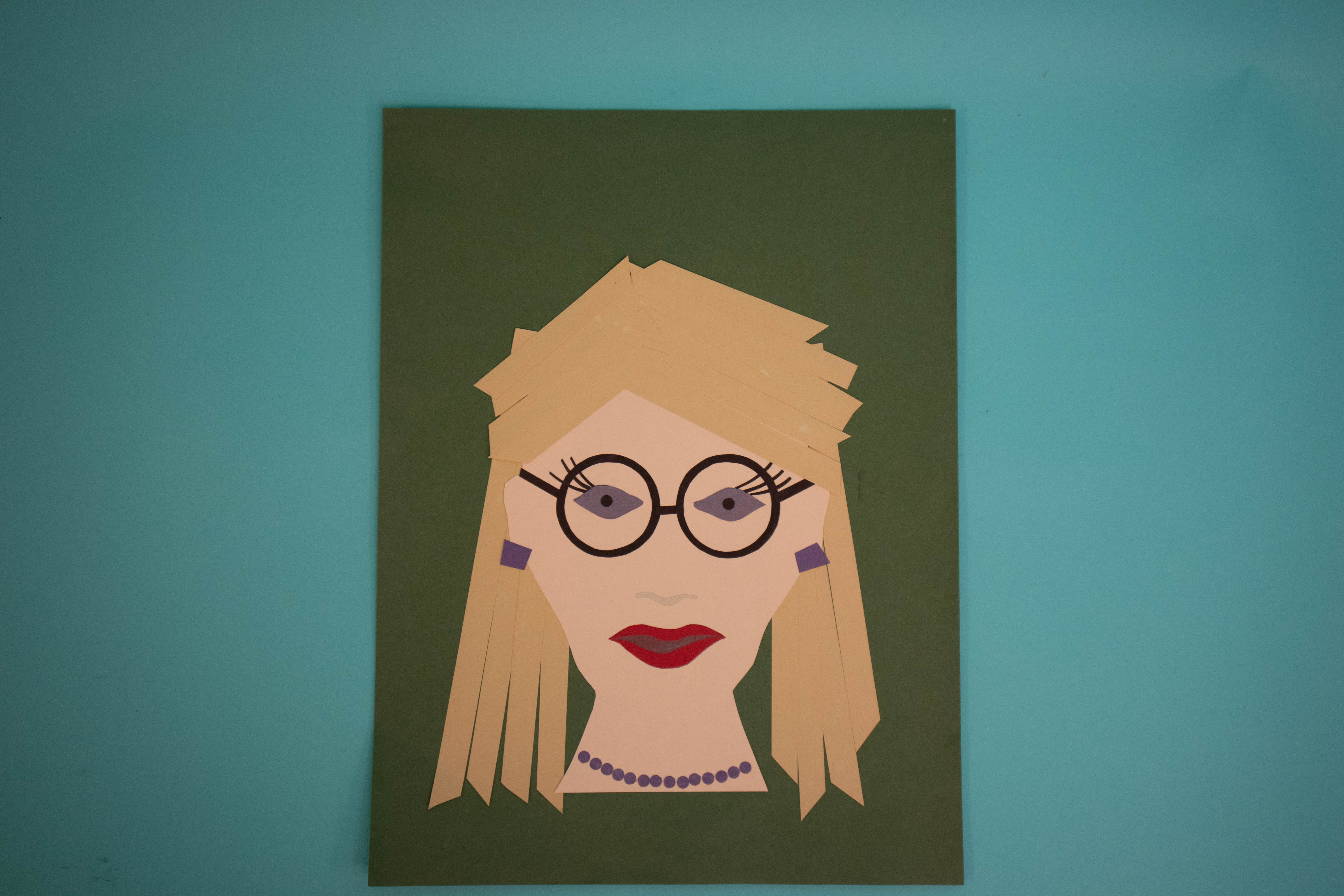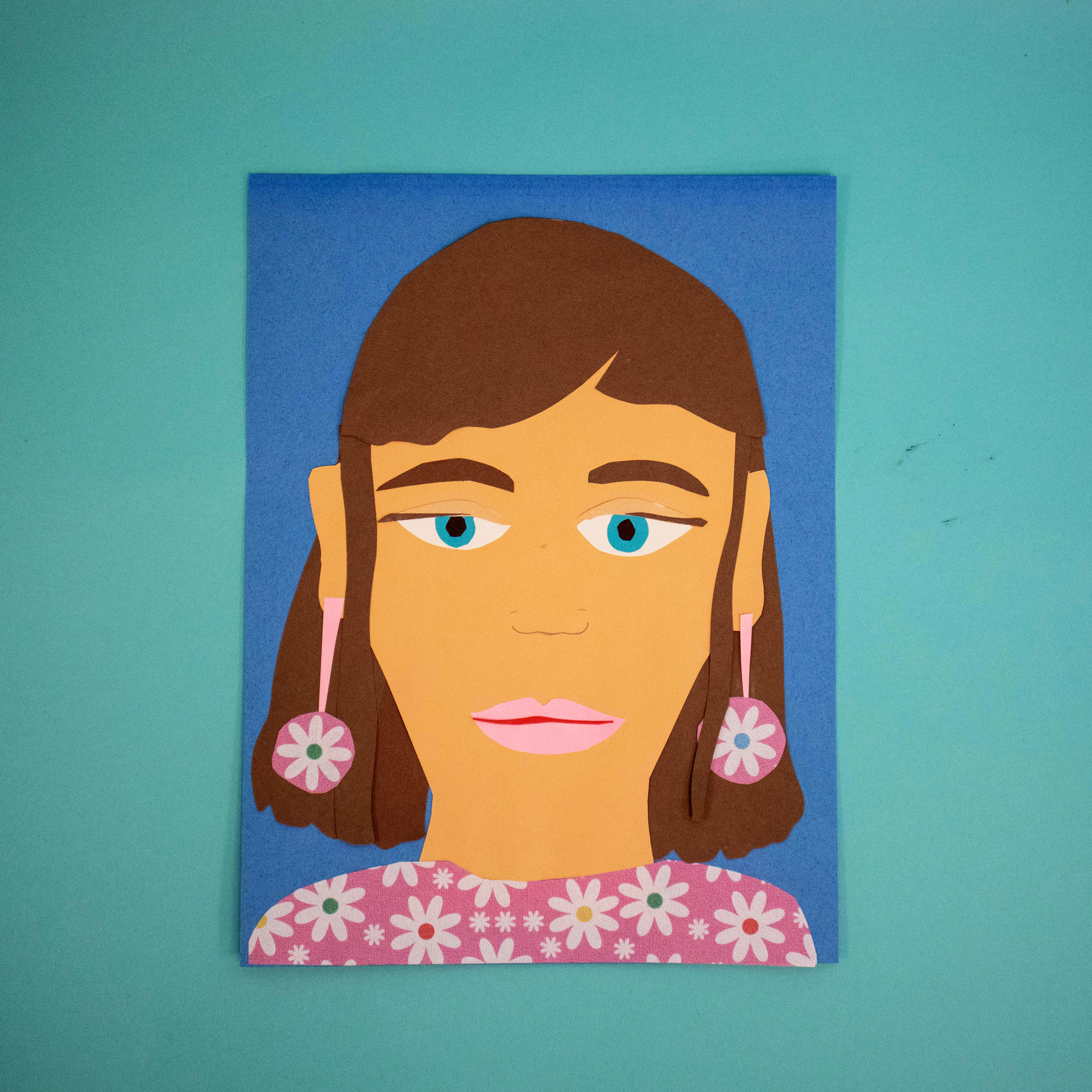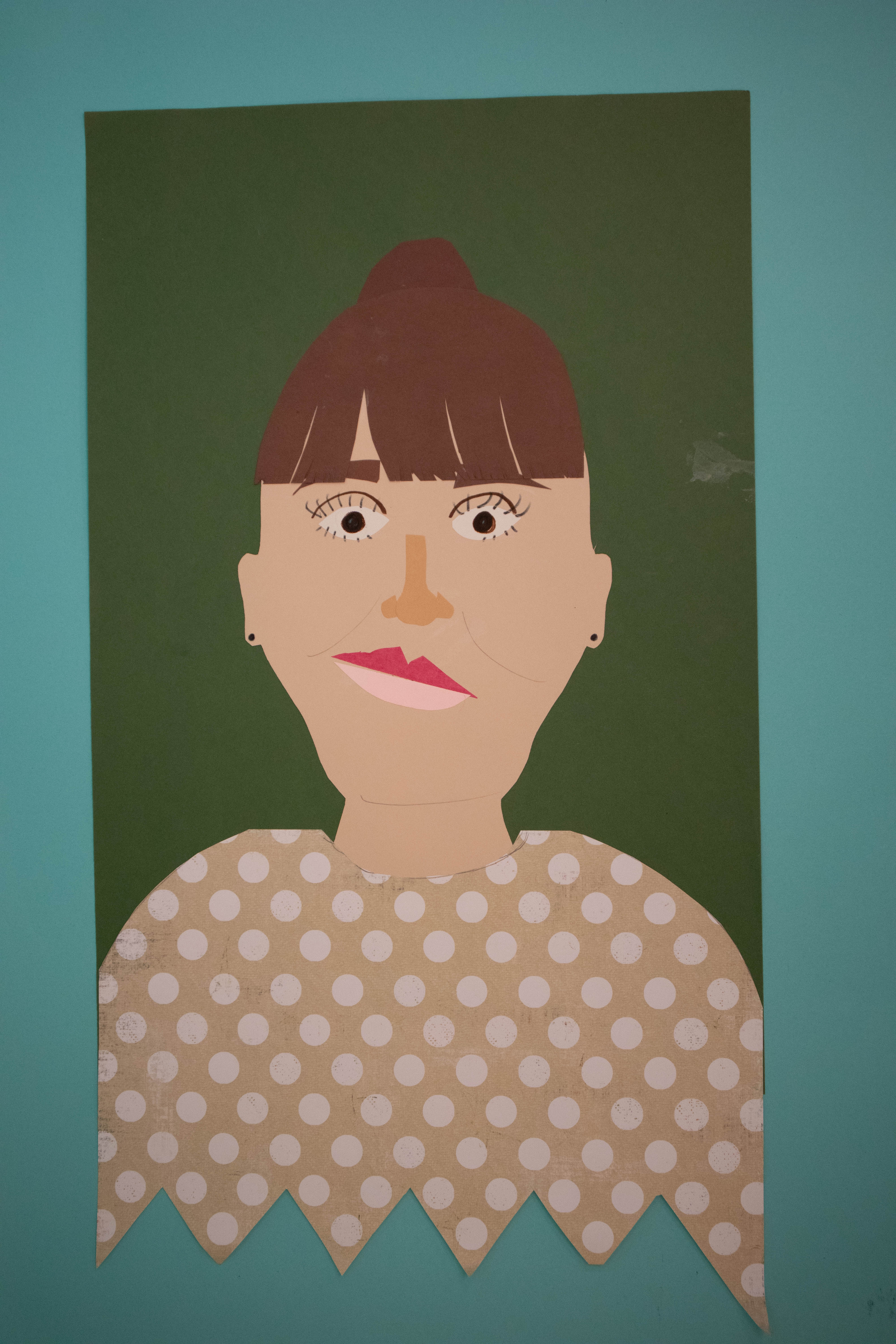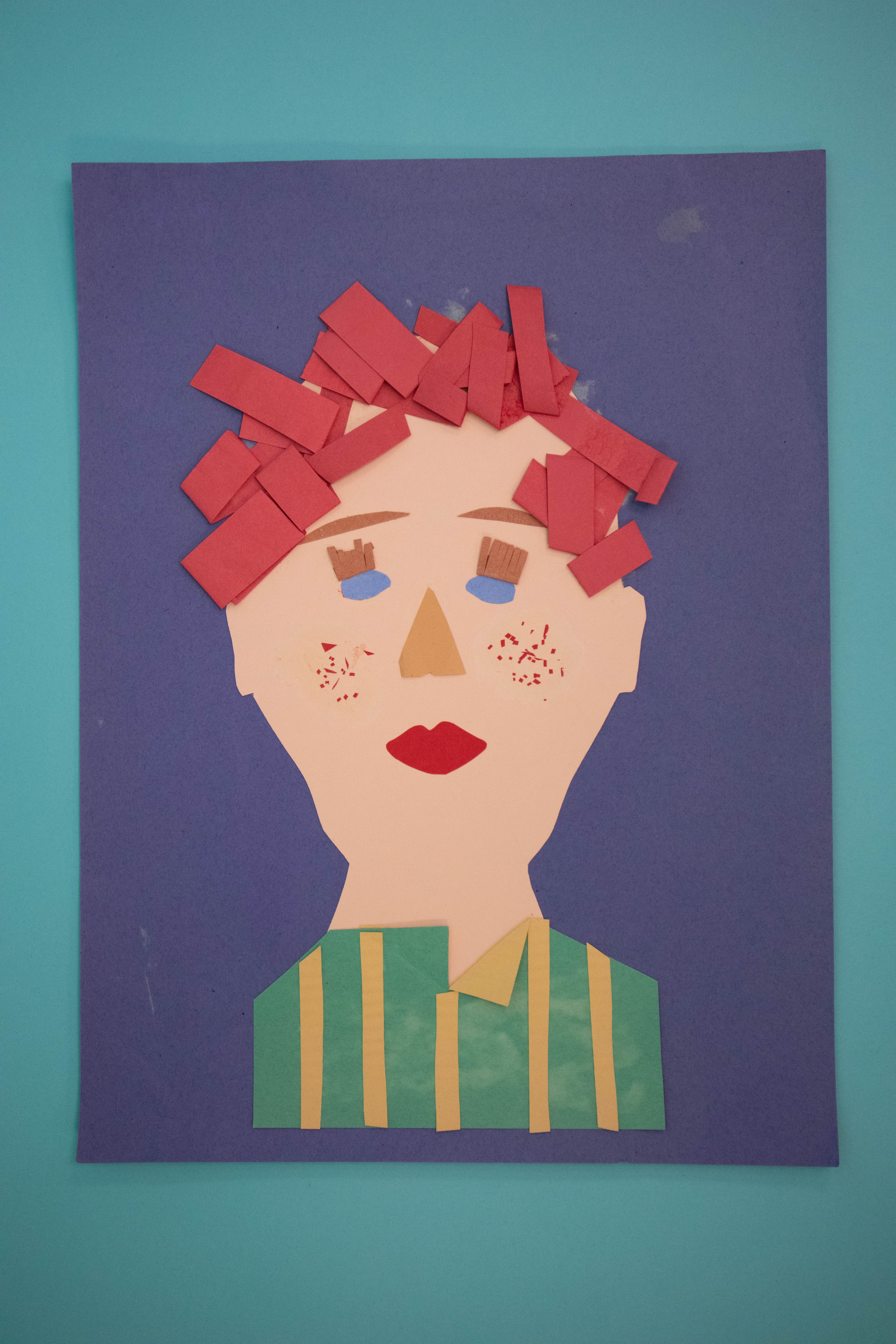Students begin by choosing a pre-cut construction paper head, from a range of skin tones, and baking paper. They will use a range of papers (and sometimes other media) to cut facial features and clothing and create a self portrait.